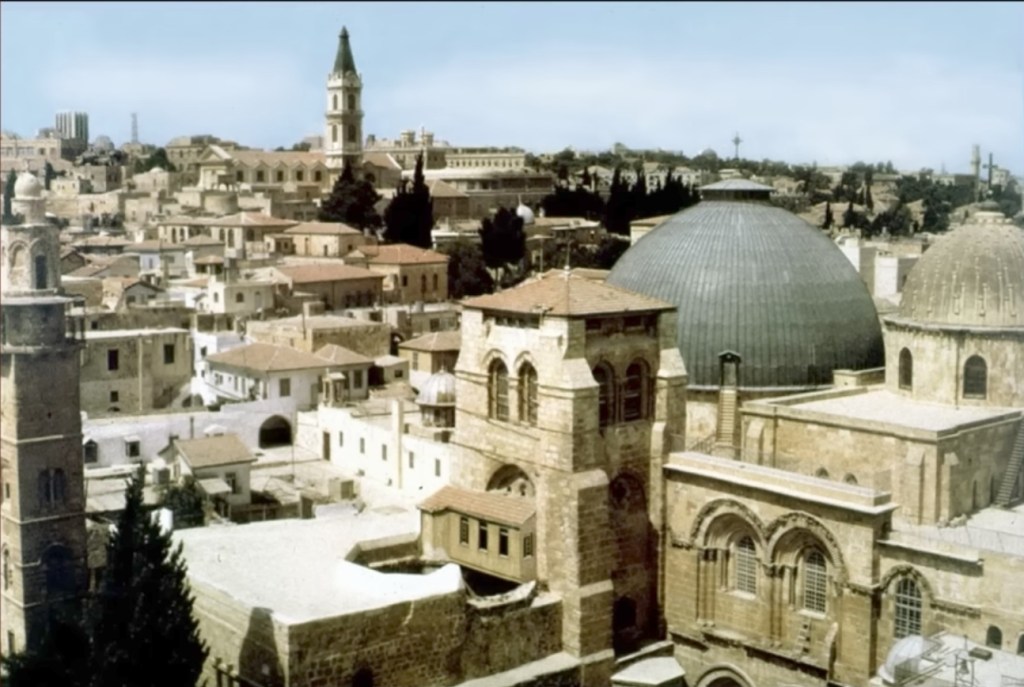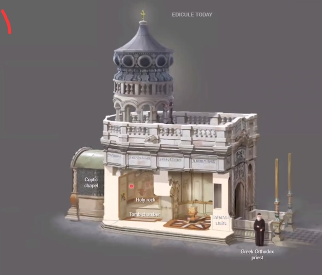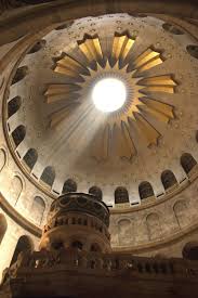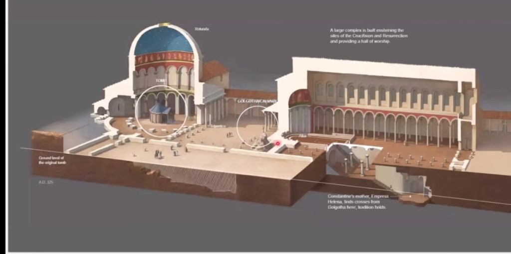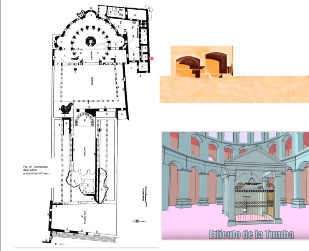 La fecha que conecta todo lo expuesto con el supuesto sepulcro donde se produjo la «anástasis» (resurrección) del Hijo de Dios es la del «Idus de Septembribus MLXXXVIII (del 1088) Ab Urbe Conditas«, o lo que en cristiano se llama el 13 de Septiembre (otra vez, y van no se cuántas) del año 335, cuando Constantino, el Grande, inauguró y propició la consagración de la basílica que engloba el lugar donde se crucificó a Cristo (el Gólgota) y a pocos metros se «encontraron» (hecho atribuido a la madre de este emperador, Santa Elena) un pozo con varias cruces, y también, donde señalaron sus adeptos, que por tradición, sabían que debajo del templo a Venus que impuso Adriano en ese antiguo lugar de culto paleocristiano, se hallaba la cripta que albergó por unas horas su cuerpo. Sobre esta cripta se construyó un edículo, templete destinado a contener reliquias o con función de tabernáculo, rodeado de una construcción circular bajo una cúpula abierta por la que la luz solar, simboliza y señala de nuevo, la procedencia divina de lo allí acontecido.