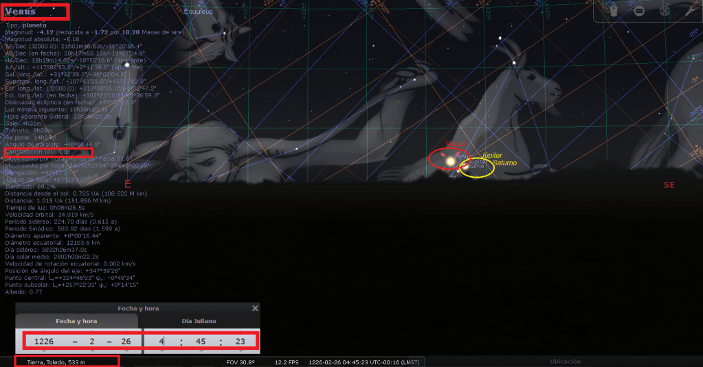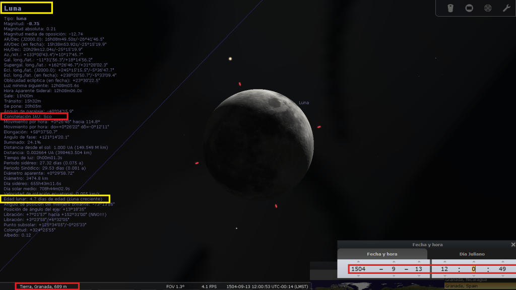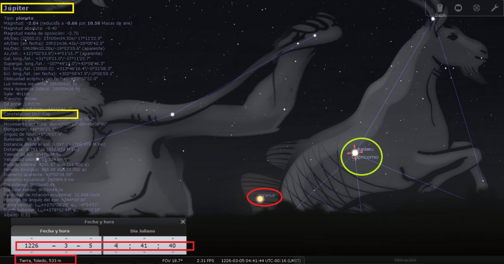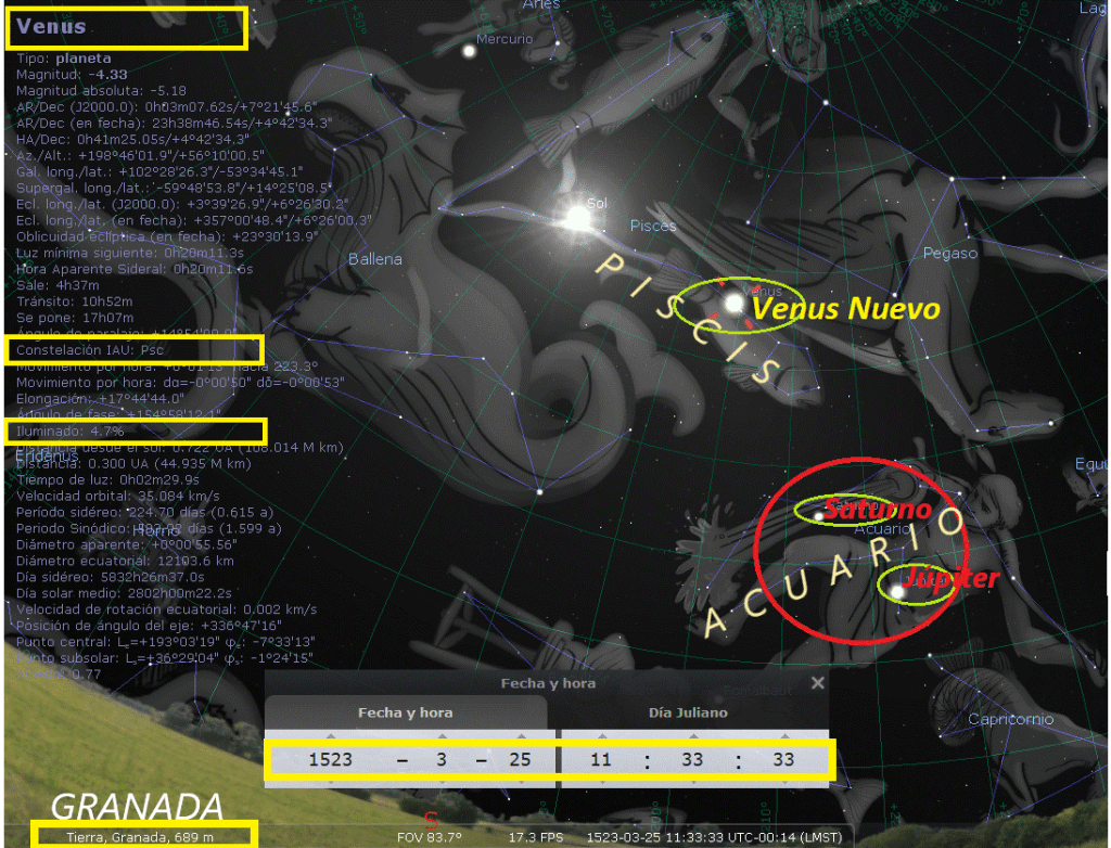 La liturgia de la colocación de la primera piedra en la catedral granadina se produjo el 25 de Marzo de 1523, día de la Anunciación del Señor (hecho simbólico de vaticinio de gran divinidad), y llevado a cabo por el arzobispo rojas Manrique. De nuevo, se produce una inauguración de sede catedralicia, con proyecto de albergar restos reales, en tiempos de Gran Conjunción; a pesar de que el suceso, en su mayor acercamiento, se dio el 30 de Enero del siguiente año, 311 días después. Pareciera un tanto forzada la alusión a esa fecha, casi una órbita solar terrestre, pero no. Atendiendo a los ciclos de 40 años que estamos dilucidando con estos sutiles periodos de tiempo, luego lo comprobaremos. El engranaje del cielo nos muestra aquí a un Venus Nuevo en Piscis, casi imperceptible para el ojo humano, acompañando en la penumbra a la vecina Acuario, que estaba gestando con lentitud la magna conjunción de Saturno y Júpiter. La Luna en cuarto creciente pone en evidencia, otra vez, el constructo de Novilunio y Plenilunio del comienzo y fin de gran obra.