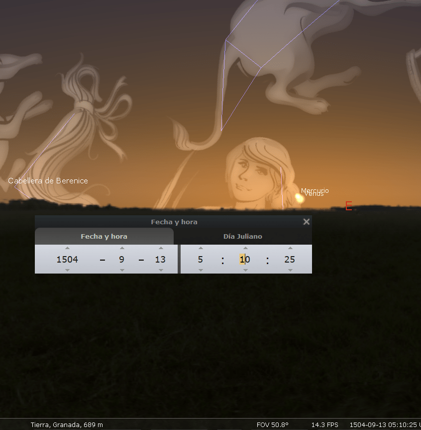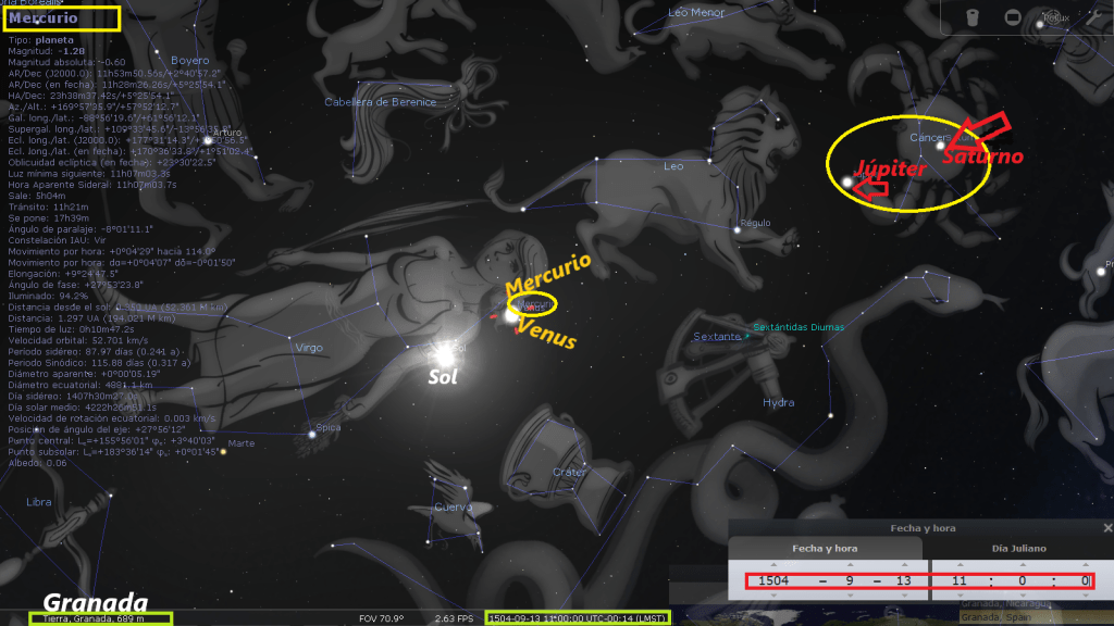 Ese día de la carta de fundación del proyecto, amanecía con una conjunción del psicopompo de los cielos, Mercurio, junto a Venus, asomando por el horizonte. El guía del umbral entre este mundo y el otro, acompañado de la fertilidad, la armonía y la belleza. La Luna se encontraba en una incipiente fase de crecimiento. Este hecho lo valoramos porque es remarcado por algunas voces relevantes de la astrología en cuanto a que una construcción o proyecto de relevancia debía ser iniciado en Luna Nueva y finalizado en fechas de plenilunio. Esto no siempre se cumple, ni mucho menos. En estas ocasiones los astrólogos parecen no tener en cuenta otros engranajes utilizados por los «titiriteros» para marcar y velar determinados acontecimientos siguiendo sus particulares rituales. En ese año de 1504 se produjo lo que conocemos como Gran Conjunción, que es una aproximación visible en los cielos entre los dos planetas gigantes, Júpiter y Saturno, siendo su punto máximo el 25 de Mayo de ese año en la constelación de los Gemelos, y viajando alejados ya en el Cangrejo, en aquel 13 de Septiembre, 111 días después. ¿Será un patrón en este juego de tumbas de tronos?