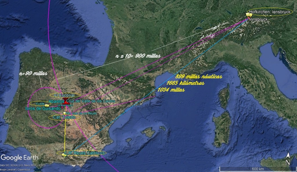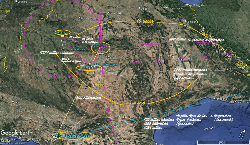 El lugar, de la hasta hacia poco Granada musulmana, había sido escogido por los Reyes Católicos y entre sus poderosos nietos, suponemos, eligieron Innsbruck para, digamos, conectar sus linajes más allá de la unión parental. El emperador Carlos V escogió el monasterio de San Jerónimo de Yuste, en la Vera cacereña para su retiro. Aquí ya nos quedan Toledo y los restos de numerosos reyes castellanos de por medio, a parte del simbolismo de la ciudad en sí. Mucho más lejana en proporción queda la Hofkirche tirolesa, que de el convento de los jerónimos, en concreto a 1005 millas romanas (con una equivalencia redondeada de 1480 metros) y a 100,7 millas romanas respectivamente; justo 9,98 veces más la distancia de la catedral toledana. No llega a 10 por poco. En una visita de Felipe II al monasterio del retiro de su padre debió de recibir las instrucciones necesarias para encontrar esa proporción divina del «10» entre los reales mausoleos. La utilización de las millas romanas aquí no es caprichosa, nos ayuda a mostrar esas distancias para lograr la unión de la religión cristiana católica y romana. Había que buscar la proporción del «10» perfecta.