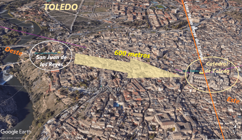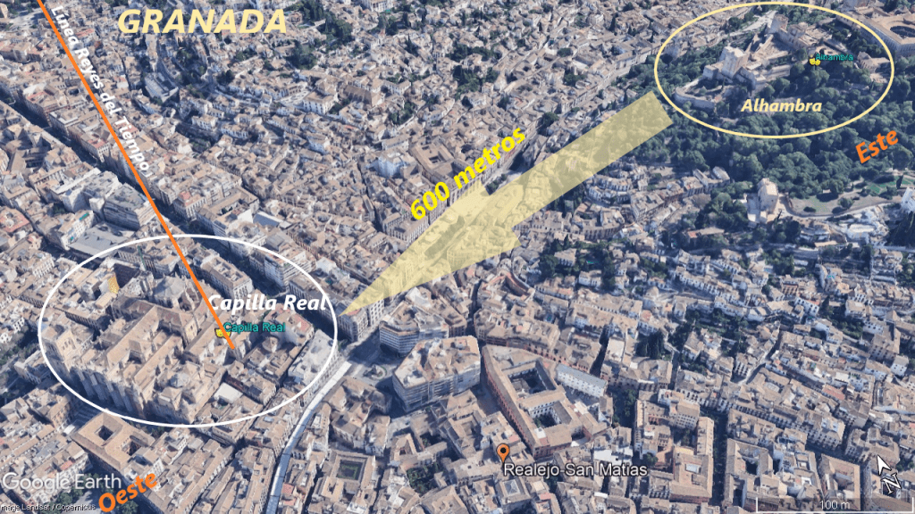 El próximo engranaje será el de las localizaciones y alineaciones terrestres. Marcaremos geográficamente en un inicio los enclaves de Toledo: San Juan de los Reyes y la Catedral que ostentó la primacía eclesiástica de Castilla y luego de España. El convento franciscano construido para ser la futura sepultura de Sus Católicas Majestades, como hemos visto, se desmarca del lugar donde descansaban varios de los regentes de Castilla con la Capilla de los Reyes Viejos, iniciada esta por Sancho IV, en el 1289, o la Capilla de los Reyes Nuevos, en la misma Catedral, iniciada por el primero de los monarcas castellanos de la dinastía de los Trastámara, Enrique II, el Fratricida. Remarcar que hubo una desambiguación de los restos reales construida por el padre de Sancho IV, Alfonso X, el Sabio, en la Capilla Real de Sevilla, cuya conquista fue llevada a cabo por el padre de este, Fernando, el Santo, en un hecho similar al de marcar la zona como hicieron los Reyes Católicos con Granada.
