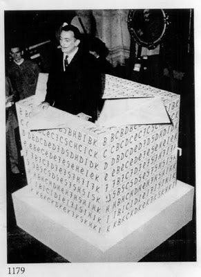 Tras varios cubos en los cielos, escondidos y otros simulados, en esta historia, y unas cuantas relaciones con dicha piedra, no podemos tomar tan singular conexión como un simple hecho anecdótico. Rasquemos en esas señales que vienen golpeando a las puertas de la curiosidad y seguro que conseguiremos esa última llave que nos acabe de encajar en tamaña cerradura. Al tirar un poco de los bigotes de Dalí para rebuscar esa afición por los cubos y Juan de Herrera nos lo encontramos en la Roma de 1954, el 1 de Junio de ese año, dando una conferencia de prensa acompañada de sus ya surrealistas performances saliendo de un cubo «meetaaafiiísssico» para, según él, demostrar al mundo el renacimiento espiritual de Dalí. La gran caja aparecía exteriormente decorada por numerosas letras divididas en celdillas coincidiendo con la propuesta del arquitecto de El Escorial para la creación del cubo. Se pone interesante…