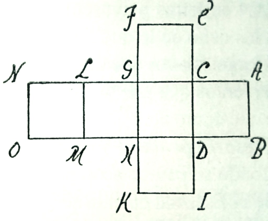 «El cubo es una figura sólida contenida en 6 superficies cuadradas iguales. Las cuales 6 superficies circundan el cubo lo constituyen, terminándolo en esta manera: Sean las 6 superficies cuadradas, AD, EG, CH, EK, GM y LO e imagínese la superficie AD levantarse en ángulos rectos sobre la línea CD y la superficie EG, levantarse, otrosí, en ángulos rectos sobre la línea CG, de tal manera que el punto E, término de la línea CE, y el punto A, sean un mismo punto, y esto ha de ser forzoso, porque las dos líneas, EC y AC, levantadas perpendicularmente sobre el punto E serán una sola línea…» Y continúa Herrera hasta describir como se crea el cubo en su totalidad para su formación.