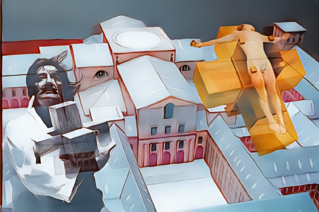 Si tiramos un poquito más de esos finos bigotillos hallamos en unas observaciones suyas hacia su cuadro que aluden a un interés por «una tan alta y poco conocida doctrina y método de saber» y, también, acerca de «los grandes y subidos misterios y secretos difíciles de calar…», que afirmaba Herrera en su obra. Las caras formadas por las letras no son cuadradas, son ligeros rectángulos. Los vértices traslucidos del cubo interior estaban marcados por un «2», y suspendido en el centro, un «3»; la dualidad en los extremos del cuerpo y la tríada, representante de la creación, como fuente de todo. Pero esa forma inicial desarrollada por el arquitecto ya la plasmó el artista catalán 6 años atrás, unos meses antes de su performance de resurrección en Roma, con una sensacional obra titulada «Corpus Hypercubus«, una singular representación de un Cristo crucificado, sin aparentes heridas físicas, suspendido en el aire sobre una extraña cruz formada por 8 cubos, en claro ascenso a los cielos. Su esposa Gala, haciendo las veces de Madre del resucitado, lo observa como maestra de ceremonias junto a un suelo ajedrezado marcado por la sombra cúbica del ritual; mientras un diminuto Sol ilumina la oscura escena desde el horizonte costero de su pueblo natal, separando cielos y tierra.