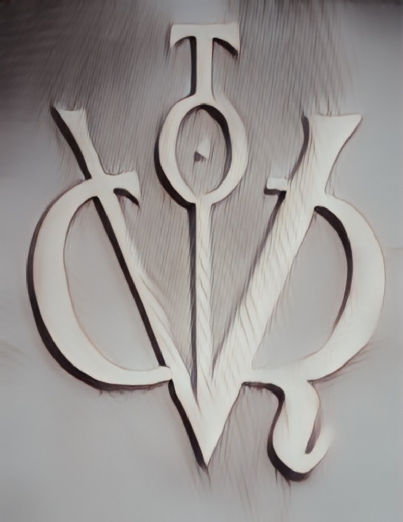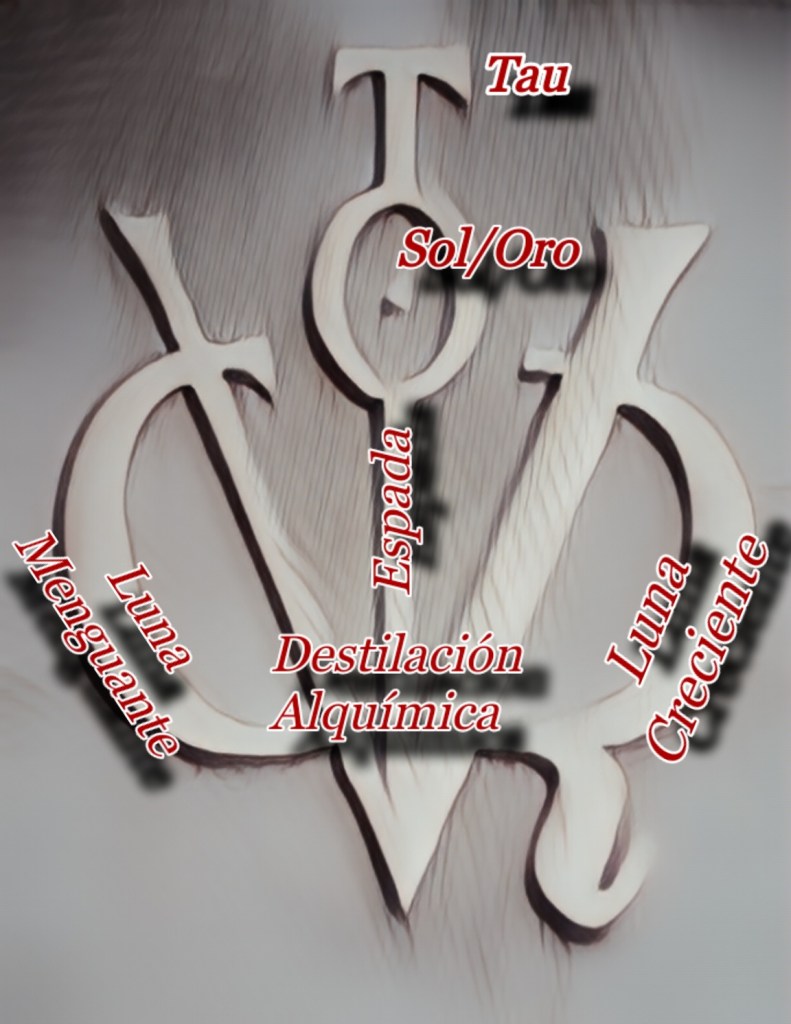 Pero veamos en que consiste el simbolismo del «vítor» por encargo que supuestamente le realizó el cabalista sefardí. La «Tau» o «T», de arriba simboliza la «Cruz»➕ de inicio y final, la energía para seguir el camino de Dios; el círculo de la «O» con el punto central, rememora el símbolo del Sol ☉ y del oro🥇; la «V» partida por la «I» es una flecha hacia abajo que nos recuerda a la destilación alquímica; la «R» junto a la «T» arriba se asemejan al símbolo de Saturno ♄; la «C» y la parte superior de la «R» imitan a las lunas creciente 🌙 y menguante 🌘