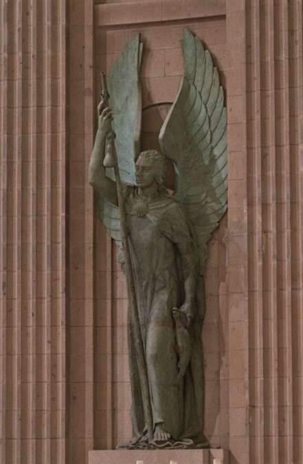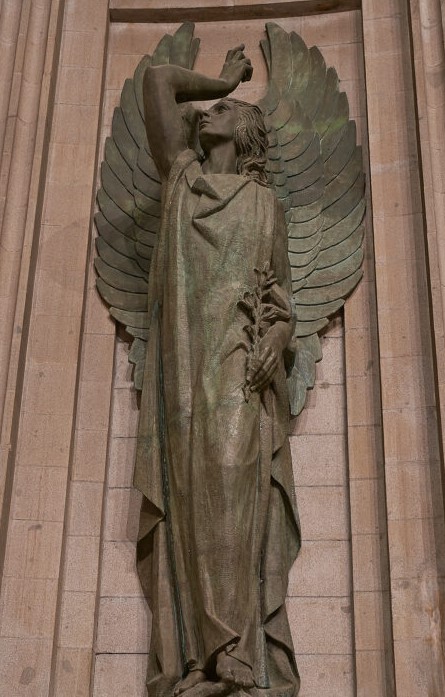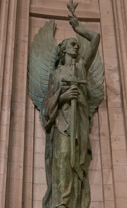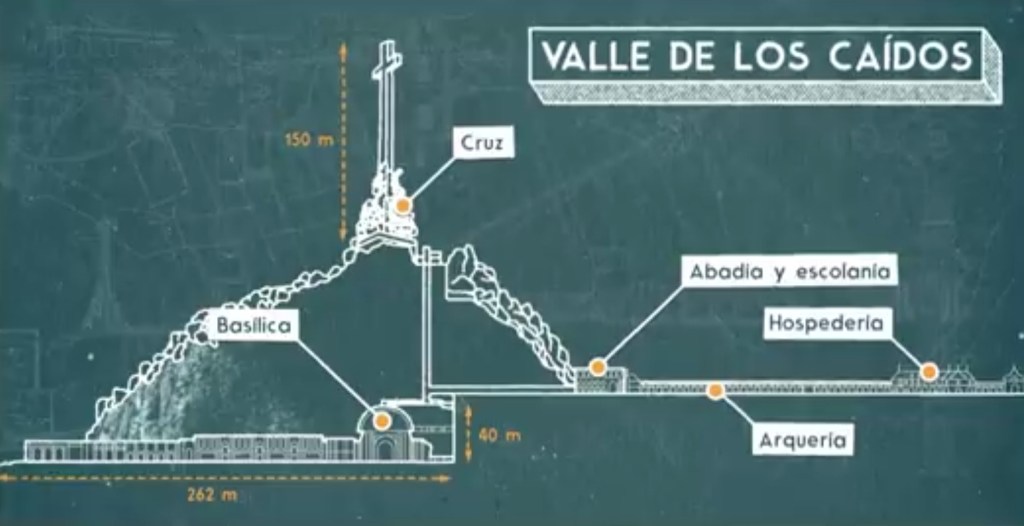 Los 262 metros de largo de la Basílica excavada en la montaña están acompañados de 6 capillas de vírgenes escogidas por el propio Caudillo. La cúpula central de 45 metros de altura y 40 de diámetro rodean los el Altar Mayor donde reposan los cuerpos de Jose Antonio, el «héroe», y del Generalísimo refundador de la patria. Estos son custodiados por un gran crucifijo cuya madera de enebro fue talada en los montes de Valsaín, de un árbol escogido en persona por el mismísimo Caudillo. Dícese en las tradiciones hebreas que del fruto del enebro se extrae un brebaje que te permite entrar en contacto directo con los ángeles tras su ingesta y de su madera que protege de demonios. De los 4 arcángeles esculpidos en bronce que rodean la cúpula, Rafael, con el báculo del peregrino, Miguel, con su espada capitaneando los ejércitos de Dios, Gabriel, el anunciador divino con los lirios en señal de pureza, y un extraño ángel con la cabeza encapuchada identificado con Uriel por algunos, y con Azrael, un misterioso personaje que actúa como psicopompo encargado de llevar las almas al cielo o al infierno. Entre las paredes del Templo descansan los restos de 33833 muertos en batalla durante la Guerra Civil, procedentes de ambos bandos que fueron llevados entre los años 1953 al 83 (datos del censo del Ministerio de Justicia). Una perpetuación de la memoria de los que cayeron en «una gloriosa cruzada», muy del estilo de las miles de reliquias de los santos martirizados en su propagación de la fe cristiana contra la herejía pagana en aquel cercano edificio de El Escorial, en precisa alineación geográfica con los restos de un gran número de reyes hispanos.