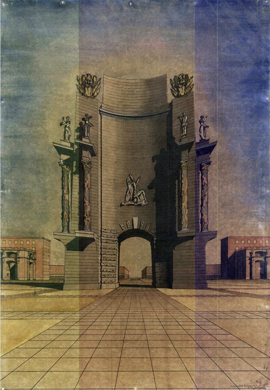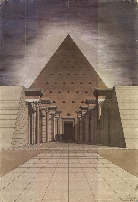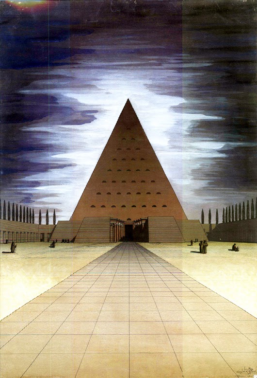 Un gran Arco triunfal con dos caras, al igual que la Puerta de Alcalá, sería el acceso al conjunto arquitectónico. La idea de la gran pirámide estaría reservada a alojar varias estatuas de los caídos en la Guerra Civil y un sepulcro reservado al «Héroe único», donde el arquitecto posiblemente estuviera pensando en la figura del líder de los falangistas, José Antonio Primo de Rivera, fusilado durante los primeros meses de la contienda. En el piso superior proyectó un enorme monumento constituido por una gran tela aupada por ángeles a modo de fuego elevador, como el paño de la Pasión de Cristo, con otros elementos alusivos al tema, como la columna, la lanza de Longinos, el lienzo de la Verónica, y en lo más alto, la Cruz. Este fue un trabajo irrealizable en ese momento, pero no nos cabe la más mínima duda de que fue la inspiración e idea desarrollada en el posterior enclave del Valle de los Caídos.