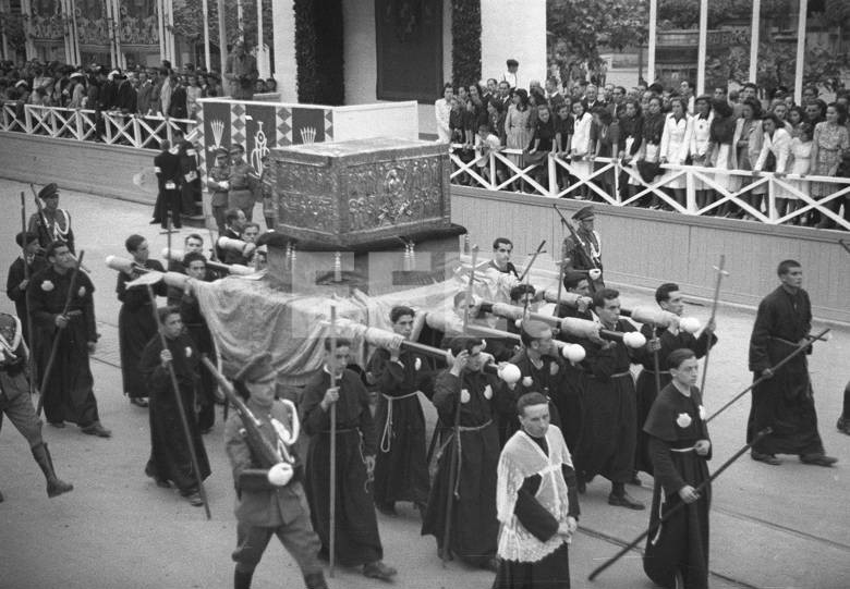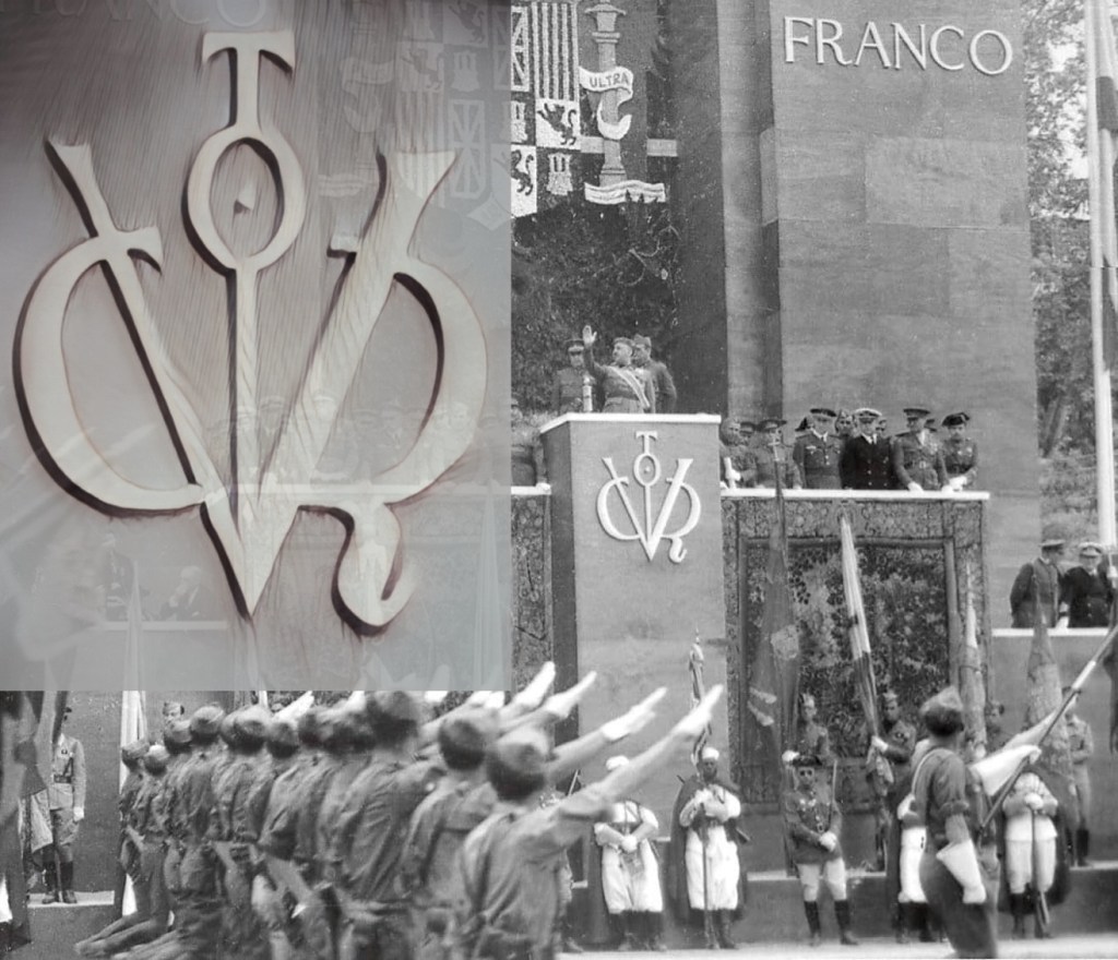 Fue sobre ese símbolo con el que apareció presidiendo el «desfile de la Victoria» en Madrid, el 19 de Mayo de 1939, con un gran arco del triunfo como escenario, de cuyas dos columnas se inscribieron tres veces la palabra Franco, a modo de vitorear su nombre, casi como aquel «santo, santo, santo» del himno utilizado en las misas católicas con letra alusiva al «Señor Omnipotente» y a su Trinidad. Del hueco del arco colgaba un gran tapiz con el águila de San Juan de los Reyes Católicos, como insignia de fundación nacional, y sobre este la inscripción de la palabra «Victoria». Queda un poco más claro el sentido principal del «vítor franquista». No así el sentido esotérico, que obviamente lo tiene.