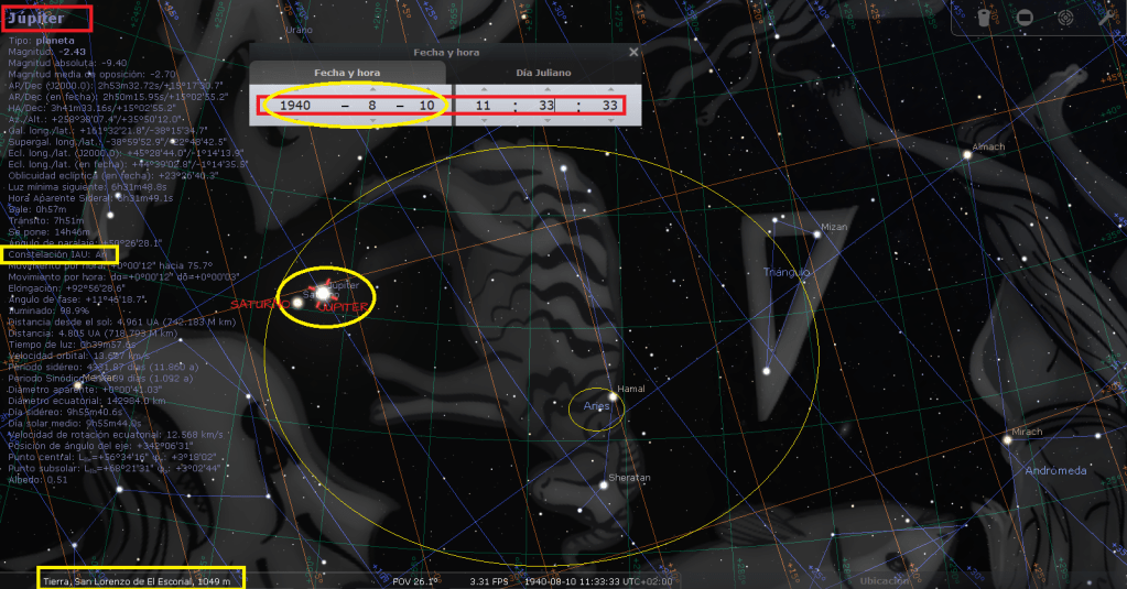 Y no iban desencaminados los cielos en la ayuda al justo proyecto del Generalísimo, según creía, y de los que hubieran detrás de su sombra, según creemos, cuando en el año en que se inició su magna obra, el Valle de los Caídos, en 1940, la Gran Conjunción de Júpiter y Saturno llegaba a su máximo las jornadas entorno al día de San Lorenzo, aquella festividad tan «católica» dedicada al laureado Sol, a Apolo y a esas luminarias tan dadas a caer esos días de Agosto recordando al Lugh de los celtas. Ya tenemos otro vínculo con los tiempos de la construcción de aquel Escorial.