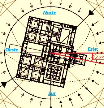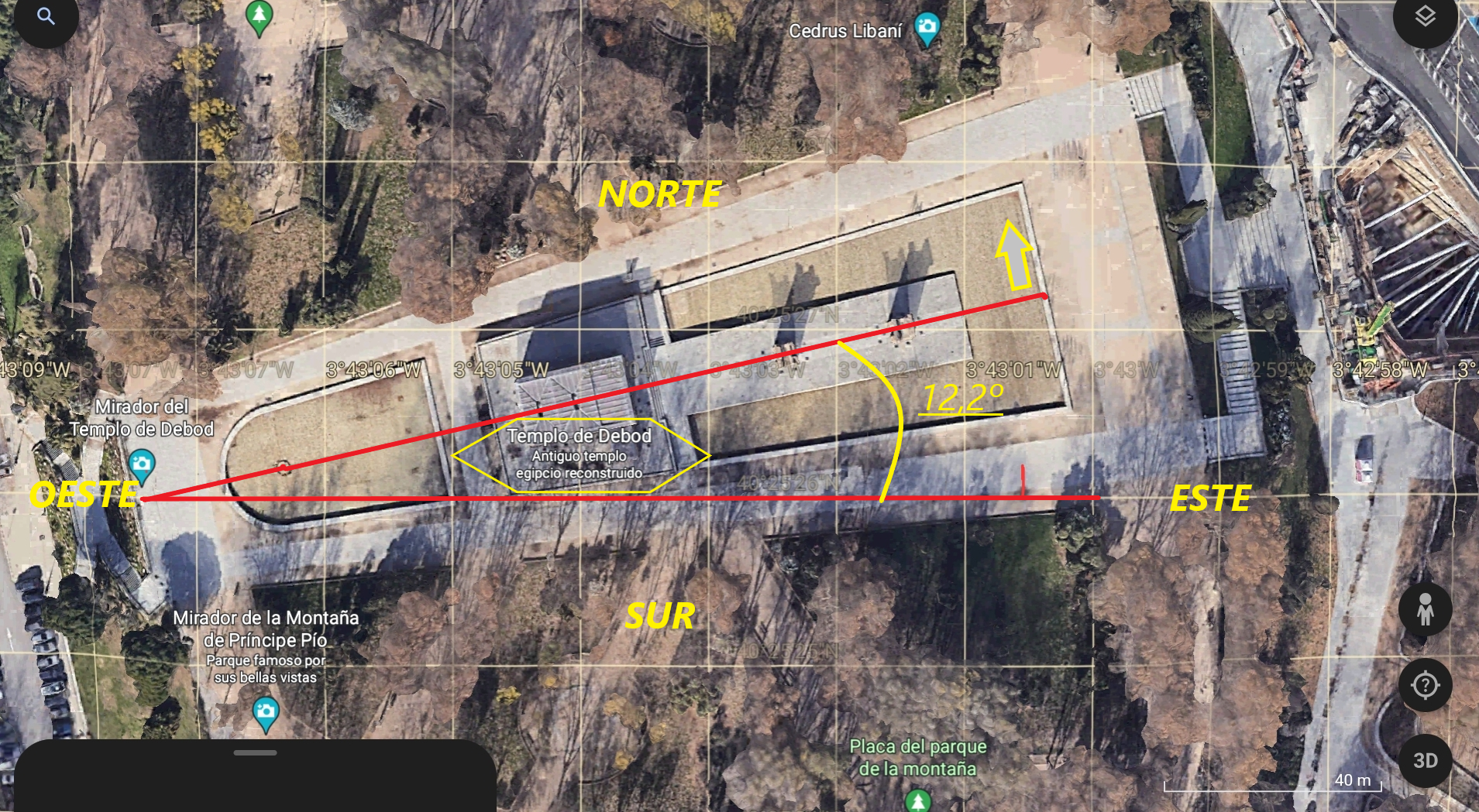 El asunto se empieza a dilucidar mejor cuando se comprueba que el grado de inclinación del eje Oeste-Este del Templo de Debod y El Escorial es el mismo, unos 12,2 grados, pero invertidos. El primero ligeramente hacia el Norte y el segundo hacia el Sur. Este hecho invierte, a su vez, el ritual de puesta y salida de Sol esos 10/11 de Abril, los días 100/101 del año. La puesta de Sol en cuestión de esos determinados días, ensombrece y señala la entrada de la Basílica del Real Sitio de San Lorenzo, por aquello del astro solar; en cambio, en esas jornadas el representante de Helios se alinea con las 3 puertas del templo egipcio, ahora madrileño, para penetrar por la entrada y marcarla. Conectar lugares en una misma fecha simbolizando de manera ritual muerte y resurrección.