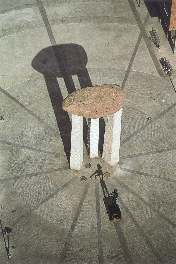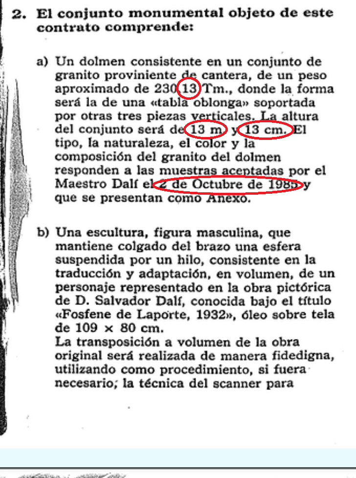 El cálculo de las disposiciones solares del templo egipcio nos ofrecía la dirección correcta al Este exacto. La salida del Sol de los equinoccios se alinea a la perfección con el monumento encargado a Salvador Dalí, en la plaza que llevaría su propio nombre y de cuyo diseño estipuló las siguientes condiciones :«Dicha plaza adoptará el nombre de plaza de Salvador Dalí y en ella se erigirá un conjunto monumental denominado «El Dolmen de Dalí», que consistirá en un grupo formado por dos elementos: un dolmen de piedra y una escultura de bronce sobre pedestal». Además, el conjunto debía tener unas medidas específicas, como la altura del dolmen de granito de tres pilares que sostiene una gran piedra oblonga, que sería de 13 metros y 13 centímetros de altura y de un peso aproximado de 230,13 toneladas. Llama la atención la fijación con el número cuyo simbolismo apunta hacia un proceso de «muerte«. La altura caprichosa aún podría resultar asequible para el constructor, pero calcular el peso de una roca granítica de esas dimensiones a vuela pluma y sobre un papel, la entendemos como algo simbólico y de precisión casi irrealizable.