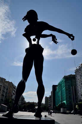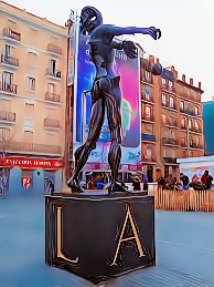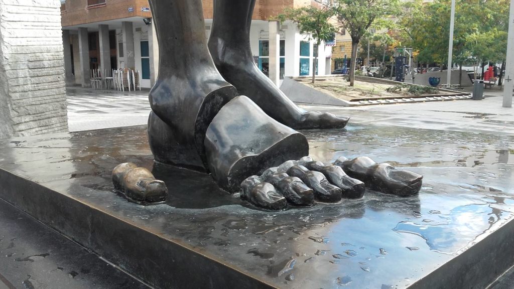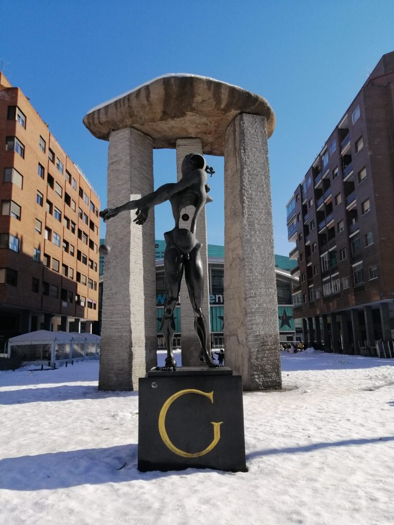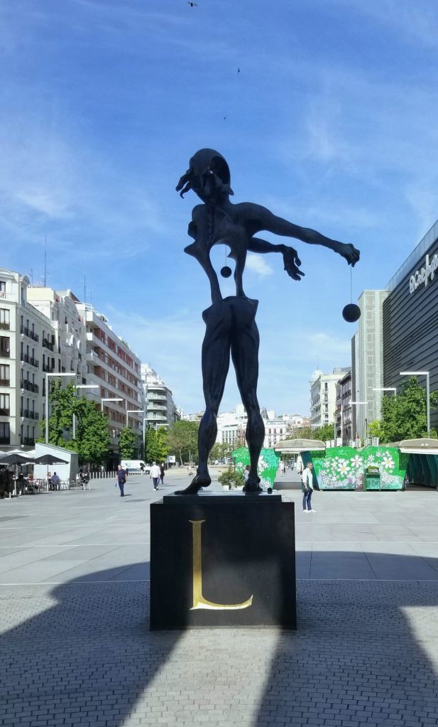 En principio, la escultura de bronce parece una composición a partir de figuras sencillas, donde se pueden observar sin dificultad a «la manzana» y el concepto de gravitación, en la esfera colgada por el fino cable y sostenida por los dedos de una mano; la luz, a través de la esfera interior proyectada en el hueco del tronco; la cabeza con forma de huevo, como símbolo ancestral de divinidad; o el pie izquierdo ligeramente elevado mostrando movimiento, con los dedos separados y cortados del derecho y otro dedo gordo al costado de este, como señal para los que vengan después o símbolo de amputación de un camino cercenado de cara a esa divinidad. Y el pedestal en forma de cubo en mármol negro con grandes letras doradas grabadas formando el nombre de su amada eterna, «Gala». Pero todo esto resultaría muy sencillo para un profano. Démosle unas vueltas al conjunto que ya tenemos la llave casi encajada en la cerradura. Ya queda poco.