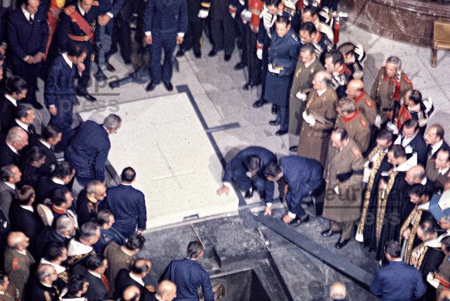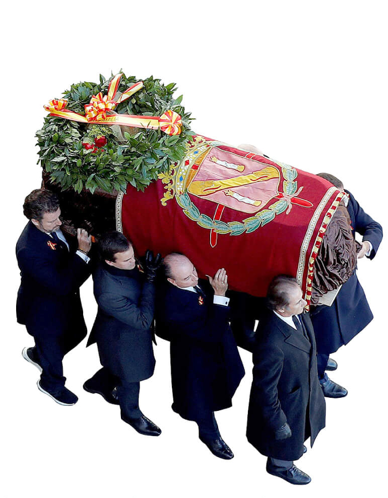 Pero lo cierto y tangible que se puede ver de manera gráfica en la salida del cadáver del gran maestro-Caudillo trasladado hacia su camino a los «cielos», hacia Oriente, es la imagen de 8 de sus familiares portando el ataúd (uno masticando chicle y todo) y al resto de los 22 familiares (número mágico) que tuvieron acceso al evento. Tal vez alguno pudiera ser el «más uno», quien sabe. Pero recurriremos al relato del historiador Bárcena en defensa de la familia oprobiada para ilustrar el suceso con el siguiente comentario: «(…) el primero de la fila que aparecía llevando el ataúd, Luis Alfonso de Borbón, era un descendiente de los Reyes Católicos, restauradores de la unidad espiritual recuperada para España por su bisabuelo, al que los enemigos de siempre acababan de desenterrar«. ¡Madre mía! Si Felipe II, «el Prudente», escuchara eso de «descendientes» de su bisabuelo y de un familiar «traspasado» a los usurpadores franceses de la Corona de España, los Borbones, por un tratado de paz de su nieto, Felipe IV, las hubiera calificado de dura afrenta, herederos de aquellos falaces monarcas que convirtieron su Escorial en un picadero. De hecho tiene razón. Toda la nobleza reinante y aspirante a coronas desciende del matrimonio de Juana, la Loca y Felipe, el Hermoso. Pero bueno, lo importante es que de cara a los «defensores» y nostálgicos del franquismo es ese simbolismo de la creencia de la recuperación espiritual de aquellos reyes de la Reconquista por parte del Caudillo, y la visión de la vuelta al régimen autoritario enfocado en las figuras de sus familiares para sus detractores y todas aquellas personas que creen vivir en una auténtica memocracia plena…, perdón, queríamos decir una democracia consentida con casi todos los derechos otorgados.