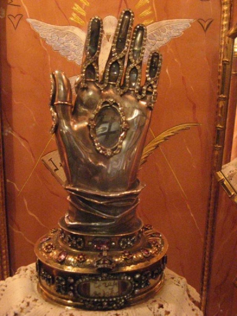 La mano, es un relicario de plata dorada con varias piedras preciosas y que contiene, se supone, ese pedazo de extremidad de la Santa. Esa mano izquierda fue arrancada por orden del padre provincial meses después de ser enterrada, el mismo padre se obsequió con un meñique para que le «acompañara en su cautiverio«. Tres años después, en otra exhumación, el cuerpo fue literalmente cuarteado, desmenuzado, esparcido por España; el pie derecho y la mandíbula superior en Roma; el corazón y brazo derecho en un relicario en el convento donde murió; y el resto…sigue incorrupto.