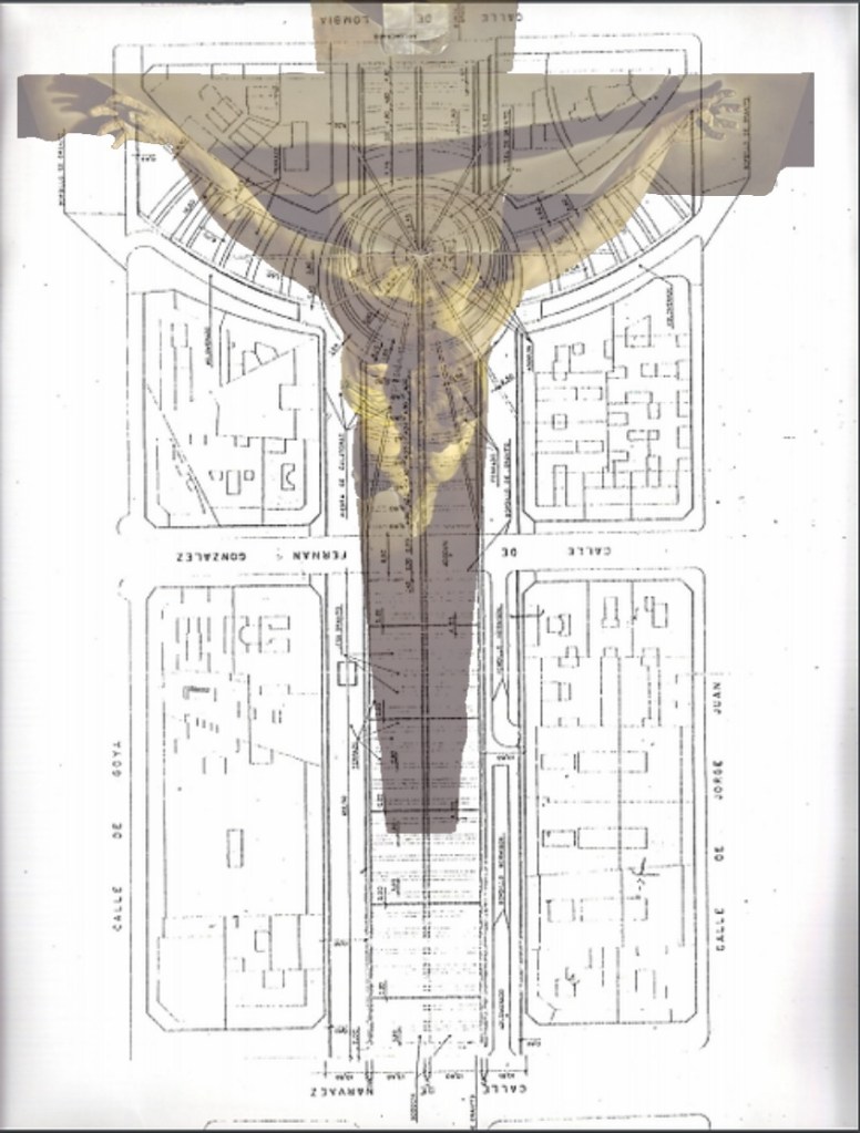 Para abordarlo bien deberemos observar el Dolmen de Dalí y su «Newton», en el que tampoco sería descabellado ver al artista encarnado en esa figura, en toda su globalidad, con todos los elementos. Nos fijaremos en el diseño de la Plaza, ahora de Salvador Dalí, antes de Felipe II, que se une a la avenida del mismo nombre, con las conexiones de la nomenclatura del callejero con los engranajes sutiles que estamos analizando. Estudiando el plano general del entorno se observa en la disposición de las calles una especie de figura en forma de tridente, con un pasaje curvado que cruza la plaza y la avenida, que recuerda a aquella obra del pintor, el «Cristo de San Juan de la Cruz«, superpuesta en el plano donde se centra la obra escultórica. Así, encajaría mejor el más que posible mensaje de muerte y resurrección simbólico, que se uniría con la exacta ubicación de la obra con respecto a las posiciones solares.
