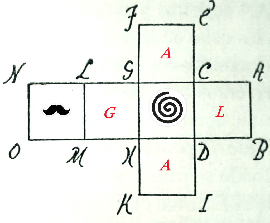 Ya a finales del siglo XIX, «MacGregor» Mathers, uno de los fundadores de la Orden secreta y hermética inglesa «Golden Dawn», de corte rosacruz, le da otra interpretación al acrónimo AGLA: «A, la primera; A, la última; G, la trinidad en la unidad; L, la completitud de la Gran Obra.» Nos centraremos en descifrar porque aparece este notarikón en un cubo negro y su relación con todo el entramado analizado. Recordemos el cuadro que hizo Dalí sobre el tratado del «Discurso sobre la forma cúbica» de Juan de Herrera y la explicación del arquitecto del templo-sacro de Felipe II sobre las superficies que circundan a la estructura del cubo, que descompuestas sus 6 caras en plano dibujan una cruz latina, y traslademos ese acrónimo de AGLA para inscribir las letras ese «notarikón» alrededor de ese cubo y reconstruirlo de nuevo de manera que esa cruz queda transformada en cubo negro «alquimizado», y circunscrito en letras del color del oro, el velado nombre del «Todopoderoso y Eterno Dios» es evocado en sus caras libres bajo el oculto nombre de la doncella-sacerdotisa del autor de la obra y perfectamente alineado con el resto de templos en un mágico engranaje que parece, digámoslo de esta manera, ponerse en marcha en fechas «evocadoras» de otro tiempo, que unen y separan, tiempos pasados y presentes, que pretenden perpetuar a esa casta-sacerdotal al servicio del PODER mayúsculo.