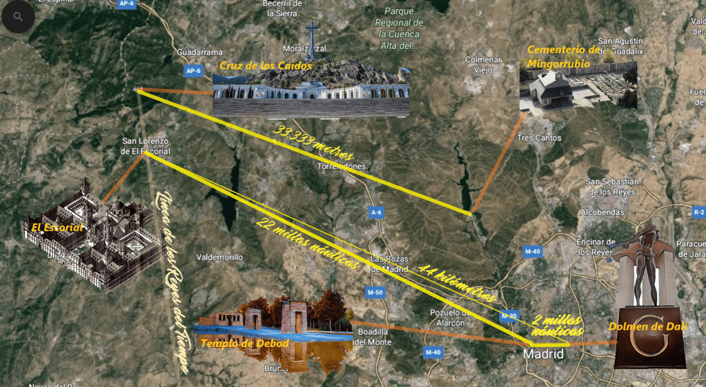 Esa peculiar distancia medida entre las dos tumbas que tenía previstas el Caudillo para sus restos, los 33,3 kilómetros que separan la Cruz de los Caídos y la cripta familiar del cementerio de Mingorrubio, debería tener, según los patrones analizados con anterioridad, una medida temporal perfectamente equivalente, relacionada, y guardada, con la exhumación-profanación y los elementos ritualizados por esta extraña orden a lo largo de las décadas pasadas. Ponemos los engranajes a funcionar y… ¡voilà! El día de aquella fecha, el 24 de Octubre del 2019, viajaban a 33 años, 3 meses y 1 semana hasta la inauguración del Dolmen de Dalí, aquel 50 aniversario del alzamiento del 36, el 17 de Julio del 1986. ¿Pero relacionarlo entonces también podríamos relacionarlo con el futuro destinado al presunto «mago negro» al servicio del «Sumo Sacerdote»?