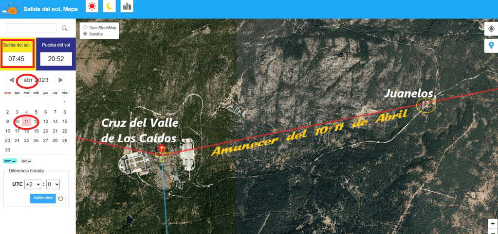 Esto lo debemos tratar de especulación, obviamente, pero analizando las fechas de ciertos acontecimientos observamos que en comparativas con los patrones de construcción de la magna obra del Rey Prudente, se muestran en fechas iguales, pero a la inversa. Nos explicamos. Si llegamos a la conclusión de que las orientaciones solares de dicho edificio estaban proyectadas para que coincidiera con el santoral en el nuevo calendario gregoriano, que sirvieran de «enganche» entre el antiguo tiempo y el nuevo; de nuevo estos engranajes «santífico-estelares» podrían haber servido de patrón, pero de manera inversa. Esto sería, conectar el tiempo actual con el antiguo de la época de la construcción de El Escorial, y además, utilizar esa línea recta milimétrica real que atravesaba, y conectaba, tantas tumbas de reyes. Ese 1 de Abril de la Victoria, conecta con la puesta de Sol del eje central del Real Sitio, pero del viejo tiempo, y con el inicio de la fecha de construcción del Valle de los Caídos y su inauguración, ambas en ese día cumpliendo el ya citado ciclo metónico de 19 años, donde las fechas de los calendarios lunares (religiosos) y solares (civiles) volvían al punto de partida en el horizonte zodiacal. Un «encuentro entre tiempos».