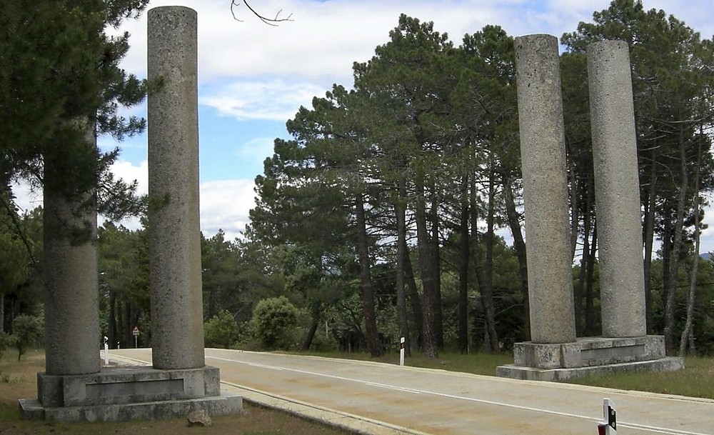 El punto inicial lo marcan las 4 columnas de 11 metros de altura, colocadas en doble columnata a ambos lados de la carretera de acceso al Valle, llamadas «los Juanelos«, por el inventor, matemático, astrónomo y relojero italiano Giovanni Torriani , que prestó sus servicios tanto a Carlos V como a su hijo. Esas imponentes estructuras, conocidas como los «Centinelas del Valle«, estaban olvidadas en Toledo tras haber sido utilizadas como contrapeso de un artificio para subir agua del río hacia la la antigua capital hispana salvando un desnivel de unos 100 metros. En su tiempo quedaron a orillas del Tajo, tal como aquellos restos de la nao portuguesa de «Las 5 Llagas» que «rescató» Felipe II para la fabricación de cruces y ataúdes reales. Como demuestran los dibujos de Muguruza, esas 4 columnas debían haber sido colocadas frente a la entrada de la fachada de la cueva-templo, pero las 54 tonelada de cada una, impidieron la llegada de aquellos «centinelas guardianes» de la montaña sagrada.