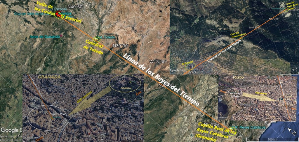 Visto y leído los hechos relatados, busquemos los engranajes que nos marquen «el lugar correcto«. Aquí ya jugamos con ventaja puesto que desde el principio, al trazar esa línea que se origina en la Capilla Real de Granada, atraviesa la Catedral de Toledo, toca El Escorial en su lado de Poniente y sube hasta la cima del monte Abantos, ya se veía con claridad que llevaba a ese otro monumento faraónico situado al otro lado, a simple vista, el conocido como Valle de los Caídos. Pero nunca nos imaginábamos que coincidiera justo en la cruz más grande de toda la cristiandad. Exactamente, metro arriba, metro abajo. Es como si el mensaje viniera de otra dimensión. Tal vez, pero encontraremos la llave. Ya no nos basta con descubrir la línea, queremos saber que hay más y a quién o a quiénes apunta.