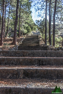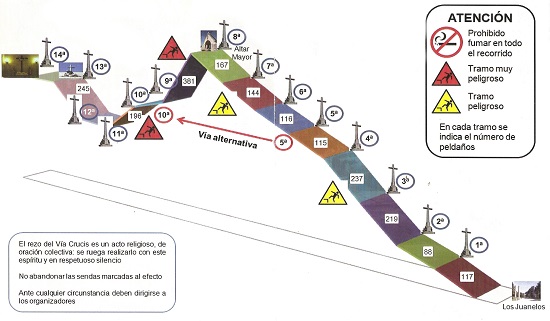 En primer lugar, salta a la vista en el entorno el camino hasta llegar al templo. Un recorrido alrededor de la montaña desde un punto concreto donde se quiso plasmar un via crucis de 14 estaciones, como mandan los cánones, que aunque no fue finalizado como se proyectó, si dejó claro su simbolismo y sus intenciones en cuanto a lo que se esperaba influir en aquellos peregrinos que culminaran el camino hasta el final de la cripta. Seguiremos los pasos que nos mostró el ujier de todas esas llaves que abren las antiguas cerraduras e intentaremos asomar la cabeza tras esos rincones marcados.